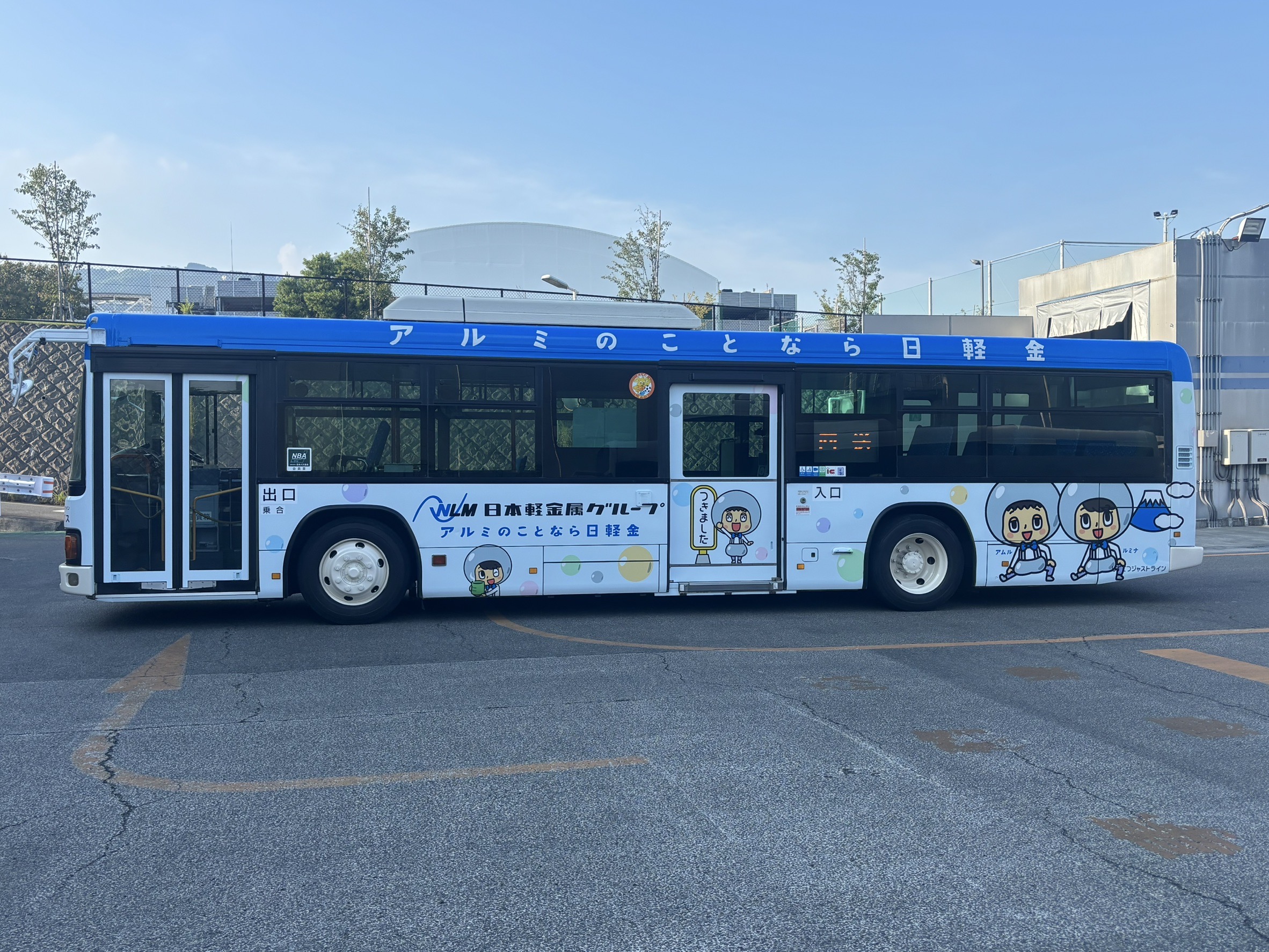 車体はコーポレートカラーのブルーを基調に、社名とともにグループキャラクターの「アムル」「ルミナ」を大きく配置。